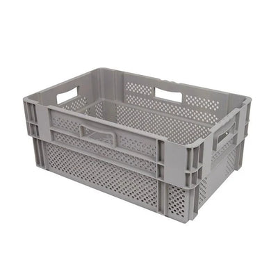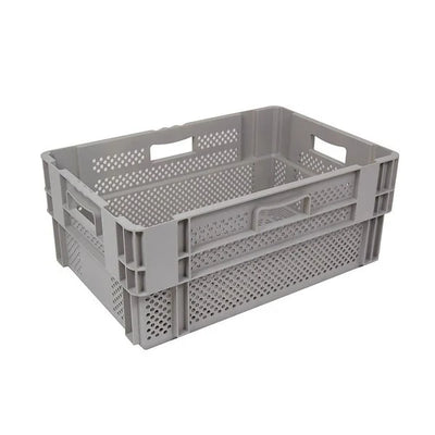 This 60-litre stack and nest box is a robust perforated plastic container, designed with ventilated side walls and base for optimal air circulation and drainage. Made from durable Polypropylene (PP), it is ideal for applications requiring moisture permeability, such as food processing, agriculture, and aquaculture.